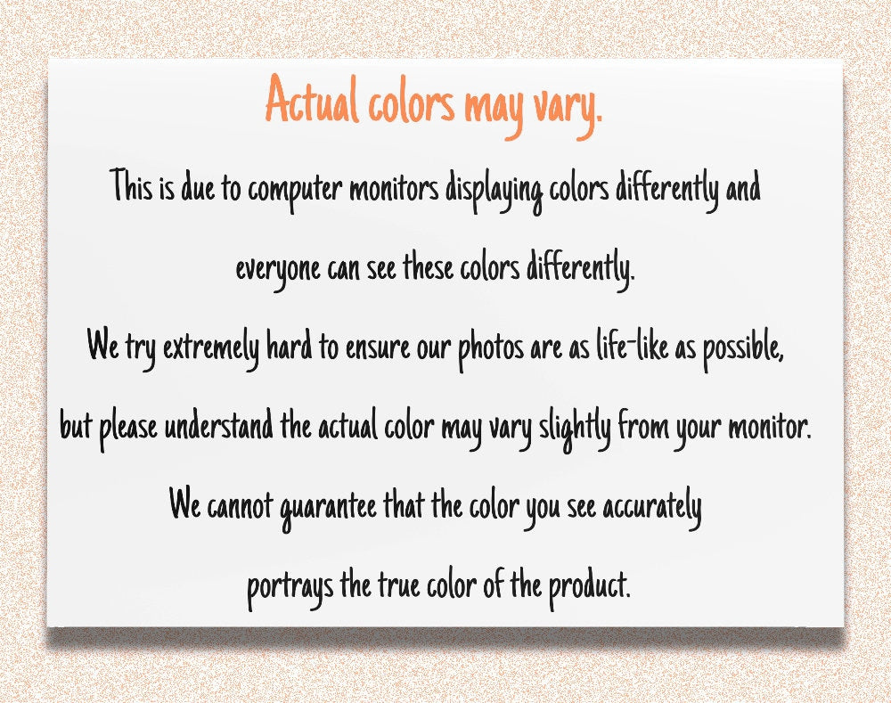 The colors on the item you receive may appear slightly different than those in our photo mockup(s). This is due to the differences between computer monitors and their color output.